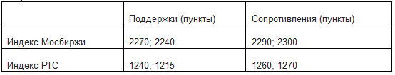 Индексы Мосбиржи и РТС в понедельник пытаются подняться выше, располагаясь в районе средних полоса Боллинжера дневных графиков (2285 и 1260 пунктов). Закрепление выше указанных отметок выступало бы позитивным для краткосрочных “быков” сигналом, но пока что значимых признаков смены тренда на восходящий не поступает.